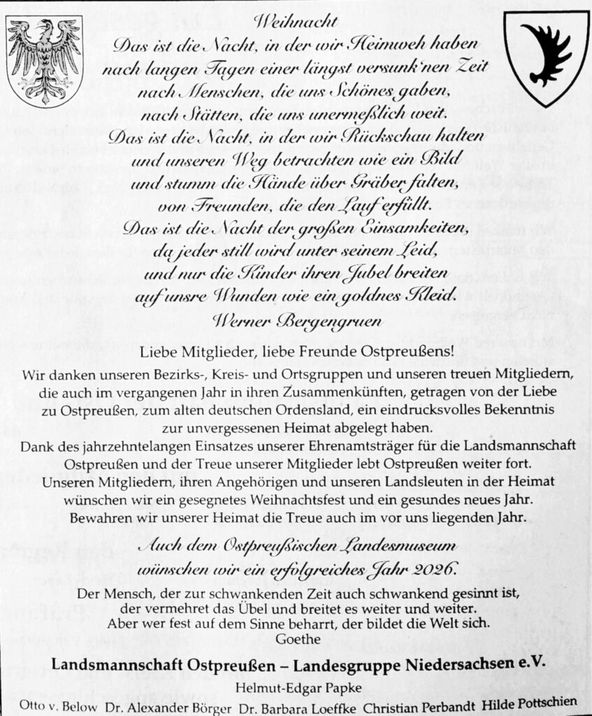 Wir begrüßen Sie herzlich auf der Internetpräsenz unserer niedersächsischen Landesgruppe der Landsmannschaft Ostpreußen!
