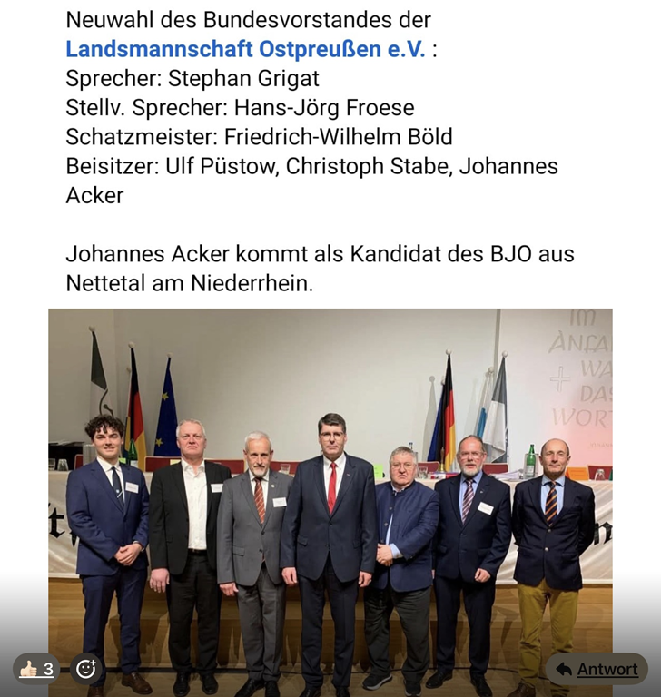 Mit großer Mehrheit wurde der bisherige Sprecher der Landsmannschaft Stephan Grigat wieder gewählt. Zum Stellvertreter wurde gewählt Hans-Jörg Froese. Auch Friedrich-Wilhelm Böld wurde als Schatzmeister im Amt bestätigt.Als Beisitzer wurden die Herren Püstow, Stabe und Acker gewählt. Wir wünschen der neu gewählten Mannschaft eine gut Zusammenarbeit und ein erfolgreiches Schaffen zum Wohle unserer ostpreußischen Sache.