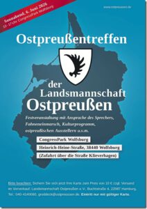 Ostpreußen aus allen Teilen Deutschlands und aus den heute zu Polen und Litauen gehörenden Gebieten Ostpreußens, der bis 1945 östlichsten Provinz Deutschlands, werden am 6. Juni 2026 im CongressPark Wolfsburg zum Treffen der Landsmannschaft Ostpreußen erwartet. Die Besucher können sich auf ein reichhaltiges und kurzweiliges Programm freuen.![]()
